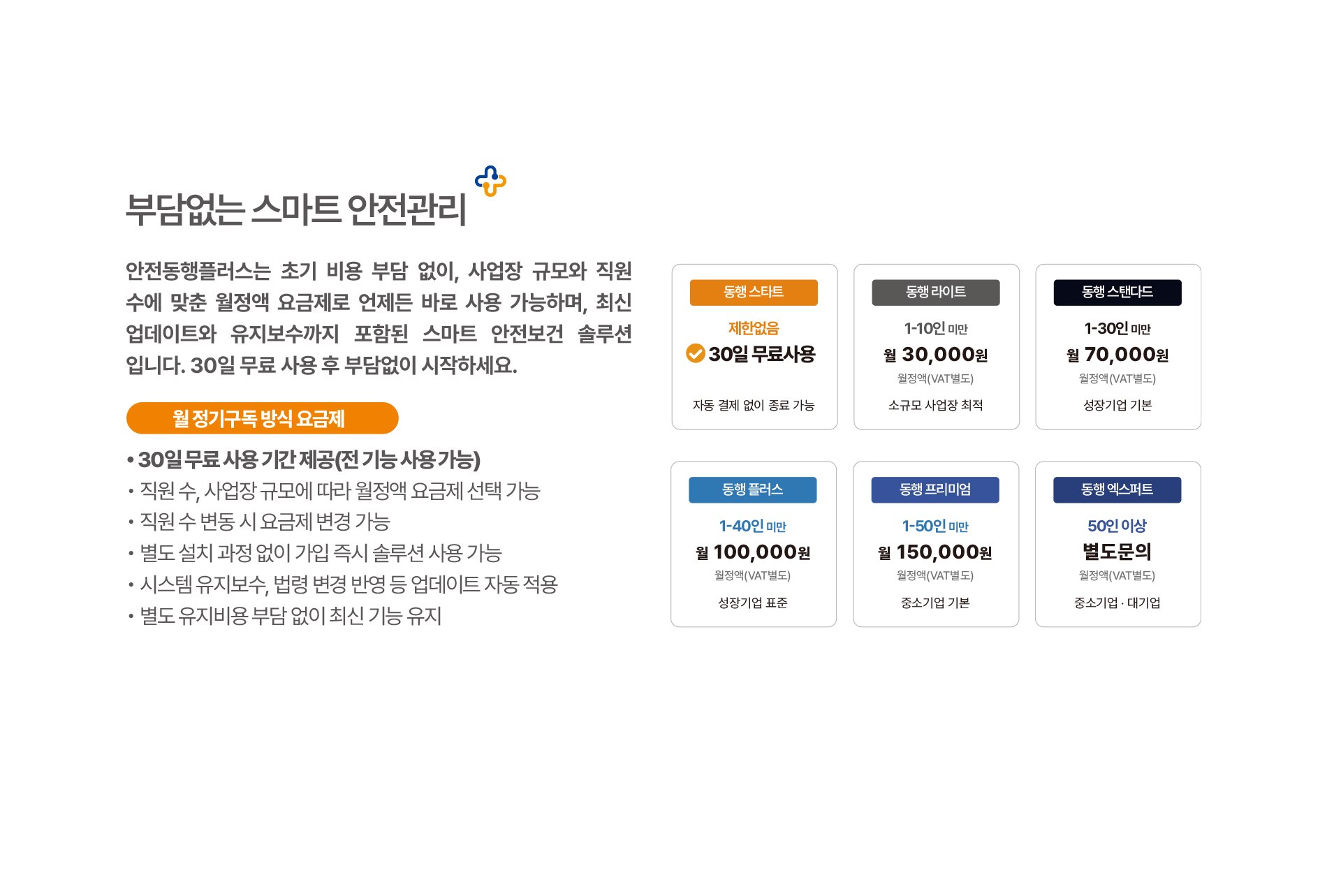 사업장 규모에 맞춰 가입비, 초기 구축비없이월정액으로 비용은 가볍게, 중처법은 든든하게 대비!30일 무료체험으로 부담없이 시작해보세요.